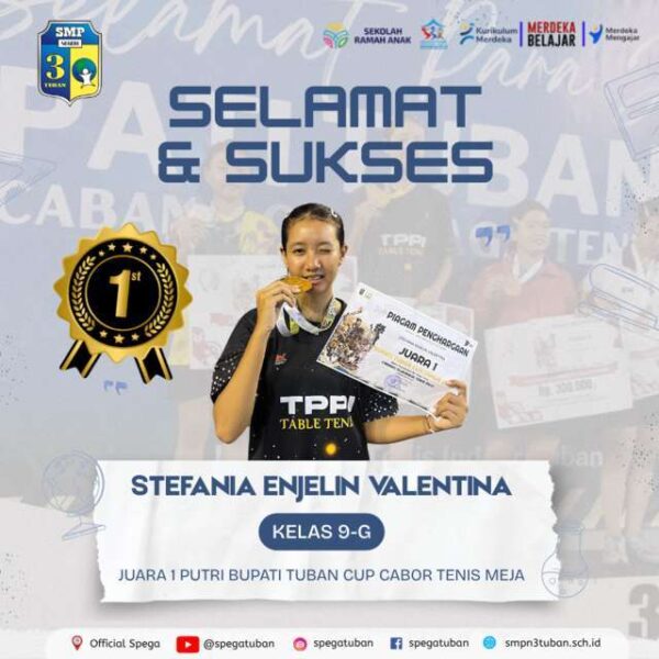 STEFANIA ENJELIN VALENTINA (Kelas 9-G) JUARA 1 Putri Bupati Tuban Cup Cabor Tenis Meja